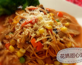 倒入一包红烧茄汁汤,再加入番茄酱及所有蔬菜
