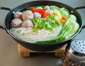 - 6. 以作法5的水当汤底,放入蔬菜续煮,以盐及白胡椒粉斟酌调味,放入丸子、面条及葱珠即可。