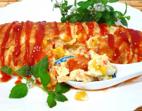 - 2. 鸡蛋打成蛋液,加绿巨人特甜玉米粒,红萝卜丁。尽量搅打有泡沫,让空气进入蛋液里。这样做出来的欧姆蛋才会蓬松软。