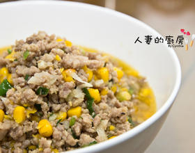再将玉米粒下锅炒一分钟,接着加黑胡椒粉及盐、水,让他滚约五分钟,要起锅前洒上大量葱花,即可盛盘。