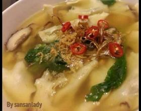 - 鲜辣椒切片,蒜米切碎,加入生抽做成沾料。 - 4. - 我是一碗一碗煮的,准备另一个锅,放入适量的汤头和冬菇让它滚再关小火,这是就开始拉面块(要吃多少就拉多少),边拉边放入锅内,拉完后开大火待滚面块浮起就是熟了(不宜煮太久),放入菜即可关火。