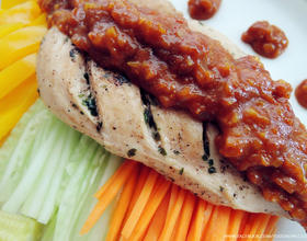 - 5. 鸡胸肉只用橄榄油煎一煎,撒上黑胡椒,一些香菜让味道更好。即可。