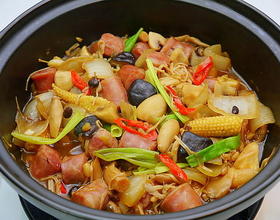 - 5. 加入所有菇类、玉米笋和香肠拌炒,再放入<调味料>翻炒均匀,大火煮滚后转小火焖10~15分钟。