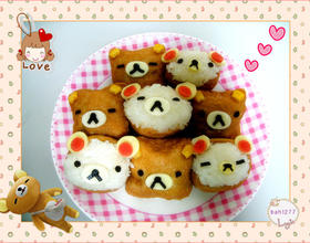 - 3. 豆皮打开先塞一点白饭,中间塞一点肉松(也可以塞自己喜欢的食材)上面再塞白饭填满~
