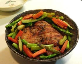 去骨鸡腿排先去除过多的皮下黄色油脂,以黑胡椒蒜粉、干燥迷迭香、一点点橄榄油进行腌制。至少腌制半小时。 - 2. 前置作业(蔬菜):