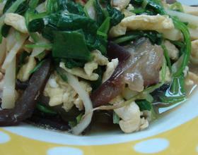 - 4. 用锅中馀油,先将葱花爆香,再加入笋丝.木耳丝及菠菜炒熟,在放下以炒熟的肉丝及蛋,并加入调味料2.,大火铲拌均匀便可盛出装盘。