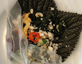 在薄米纸上,铺上香草,海苔酥,辣萝卜干,爆米香等材料,卷起即成.