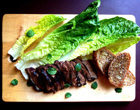 煎好的鸭胸先静置5分钟再切薄片,淋上少许锅内的鸭油,撒上薄荷叶即可