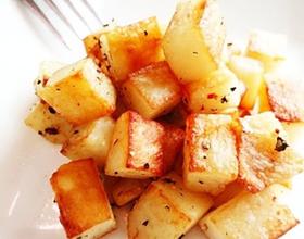 - 2. 平底过倒入橄榄油,开火热锅。水分甩干的马铃薯丁放在平底锅周围烘烤30秒。