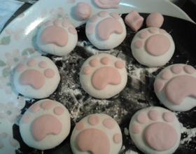 - 6. 取适量糯米团加入红色食用色素,捏出肉球状放到白色糯米团上。