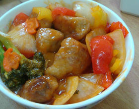 - 4. 加入[洋葱]、[彩椒切片(红)、(黄)]、[花椰菜]、[红萝卜造型切片]快速拌炒至亮色,即可起锅。