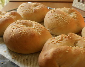 - 5. 面团取出后,洒手粉整圆。静置30分钟。分割成六等分,包入花生酱,中间发酵10分钟。最终发酵40分钟。发酵好的面包抹上些液状奶油,洒上芝麻。