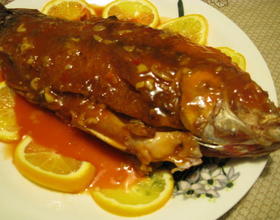 鱼洗净擦干,抹上少许盐巴,下油锅炸至金黄色后呈盘备用,2/3颗柳橙压成柳橙汁,其馀切片装饰用