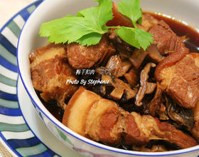 热油锅爆香葱姜蒜~放进切块的肉和香菇后转大火翻炒逼出油脂~放进梅干菜继续翻炒香~倒进酱油和米酒,糖大火煮开至酱香味出来后放进水和泡香菇的水量以淹过食材左右...大火煮滚后转小火续煮1个小时左右即可完成!