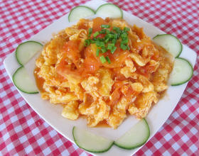 热少许油下西红杮翻炒片刻,倒下番茄酱和糖炒匀。