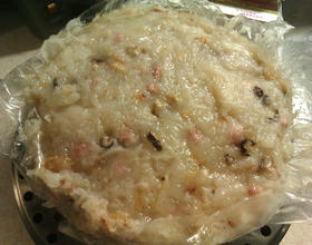 - 1. 将香菇、香肠切丁,虾米泡水。在来米粉、玉米粉加水调成粉浆。(留半杯水)