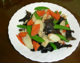 将红萝卜,黑木耳,甜豆川烫一下备用