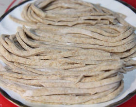 将面团桿成一个大圆圈,约是桿成薄度为0.2-0.3CM左右大小,之后对折成三折,开始切,我喜欢有嚼劲,所以宽度切比较宽约0.4CM。