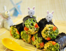 将海苔片抹一层低脂原味酸奶,再将准备好的蔬菜铺上,最后再均匀地撒些花生糖粉和南瓜酥(甘松),包卷成长条状即可。
