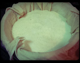 豆浆袋铺在锅子里,打好的豆浆就直接到上去 - 6. 抓起来用力地旋转把豆浆给挤出来