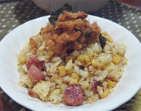 註:我不喜欢吃到丁,所以用蒜泥提味。请依自己喜欢的口味变化 ^ ^註一:我是用半盒盒装的蒜味小香肠,因为不想看炉火,所以蒸熟才用;生肉直接煎熟,炒饭会比较香。註二:罐头玉米糖太甜,用开水沖泡能减少甜味(by阿基师,这很实用)註三:不要用锅铲压饭,不然会黏黏煳煳的。註四:起锅前加奶油除了增加香气外,饭看起来会油亮,别多一点点就好(by詹姆士,这很实用),喜欢葱也在这时候拌入。