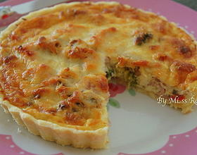 - 9. 制作馅料。在锅内放入少许的油,把培根煎至出油后,放入洋葱丁、蘑菇片、红椒丁和青花椰菜炒软,再加入盐和黑胡椒调味