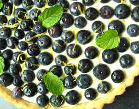将奶油乳酪馅倒进塔皮抹平,铺上蓝莓,点缀上柠檬皮丝与薄荷叶就完成了!