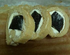 - 14. 抹上奶油夹馅放上黑糖冻卷起来开口朝下放入冰箱冷藏约2-3小时再取切片
