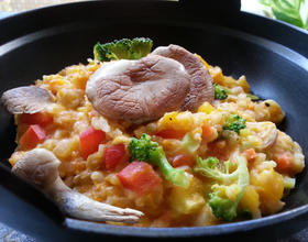- 2. 白萝卜、鲍鱼菇干锅中火煎到表面呈金黄色泽,加一些植物油、陆续下红萝卜、杏鲍菇、牛番茄、玉米粒炒到有锅气、地瓜糙米饭加进去、加水2碗、小火焖煮10分钟