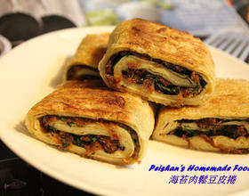 生豆包摊开, 放上海苔, 在海苔上抹少许的美乃滋后, 铺上肉松与香菜