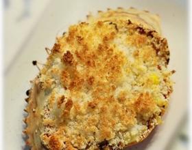 - 5. 在蟹盖内涂上一层茄汁,再饟入蟹肉材料,最后放上已混和面包糠(涂上一层茄汁,主要令蟹肉多点味道上层次感,可以不加)。