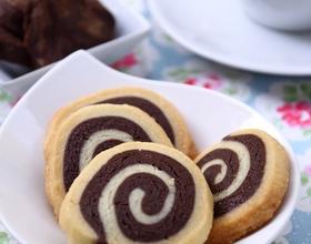- 3. 将白色及黑色面团分别桿开约3mm厚度的长方形,先在白面皮上涂上蛋白,接着盖上黑色面皮,将不整齐的边缘切平整,在黑色面皮上涂上蛋白,从较短的一边卷起来成一长条状,用保鲜膜包起来冰冰箱至少一小时.