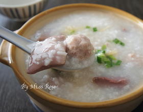 - 6. 将白粥煮滚后,加入步骤4的小肉丸和步骤5的猪肝煮滚,再加入盐和白胡椒粉调味,并撒下姜丝和葱末即可