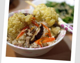 - 4. 将花椰菜放入翻炒3分钟,再下洗净的白米及水,以及所有调味料混合均匀,煮至沸腾。