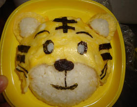 用海苔剪成眉毛,眼睛,嘴巴,鼻子与老虎纹路,贴在蛋皮上适当位置