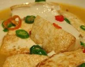 将煎好的豆腐块放入鸡汤中煨至入味取出。