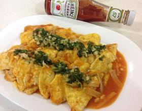- 9. 蛋饺捞起摆盘,再放入葱末,让葱末吸点汤汁,再将全 部的汤汁烩在蛋饺上,就完成好吃又下饭的茄汁烩蛋饺。