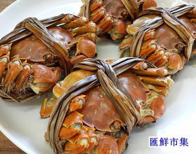 - 2. 【汇鲜市集】卖的大闸蟹是做过SPA的,在蒸之前不用再刷过,用清水沖洗一下即可入锅蒸,蒸的时候腹部朝上(和照片相反面)放上姜片,盐放入酒中拌至溶化,淋在大闸蟹上。(如果是买大陆的大闸蟹,建议先放入冷冻库将大闸蟹冻晕,再刷洗过比较干净)