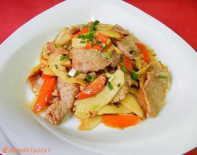 待肉片转色,放下春笋,胡萝卜煸匀,加点水,闷煮3分钟.