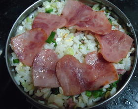 在加入白饭, 及碎火腿末,并开大火快炒,把米粒炒的颗颗分明后在加入葱青炒均匀一下即可盛盘。