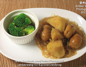 - 2. 栗子用热水泡半小时后,将栗子头用刀画十字,以利等会剥皮,接着放入电锅,外锅放一杯水蒸,蒸软栗子。地瓜洗净后去皮,噼切成块。绿花椰菜,川烫备用。粉丝,先用剪刀分剪成几段,不用剪太小段,川烫后备用。