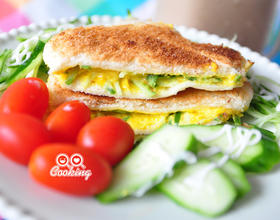 - 5. 将冰凉的南瓜泥沙拉涂抹在两片土司上并铺上小黄瓜丝,将两片吐司夹住后,使用可爱小花煎蛋器将土司压成花边形状(也可以使用蛋糕杯等小物)