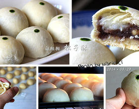 然后将揉好的《松子乌豆沙》馅球放在麻糬上面