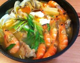 5最后将蛤蜊和虾子陆续放入锅中,要熄火时再加蒜的绿色部份就ok啰