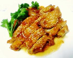 - 5. 将作法4的酱汁煮至浓缩入味,盛盘时再切成条状、撒上白芝麻、摆上小豆苗(或香菜)即可