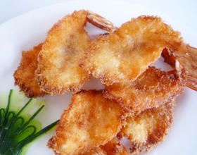 炒锅倒油,油温六成热,下入沾好面包渣的大虾,炸制金黄色即可。
