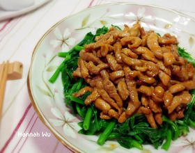 热油锅,放入肉丝拌炒至变色,续加入酱汁材料煮沸,翻炒至收汁入味即可起锅,盛放于大豆苗上即可食用。