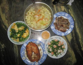 先滚水,在放入削好且切块状的苹果,切高丽菜,胡萝卜切条丝,加少许盐、鲜鸡精、香油调味,熟,上桌。 - 2. 『菠菜蛋皮丝』-