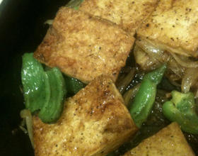 平底锅煎豆腐煎至两面金黄,加入酱油和酱油膏,吱吱作响时再加入一点水。