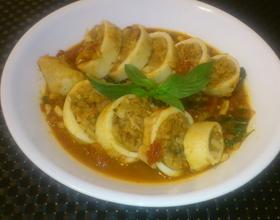 - 17. 尾端剪一小洞,用汤匙将炖饭塞入